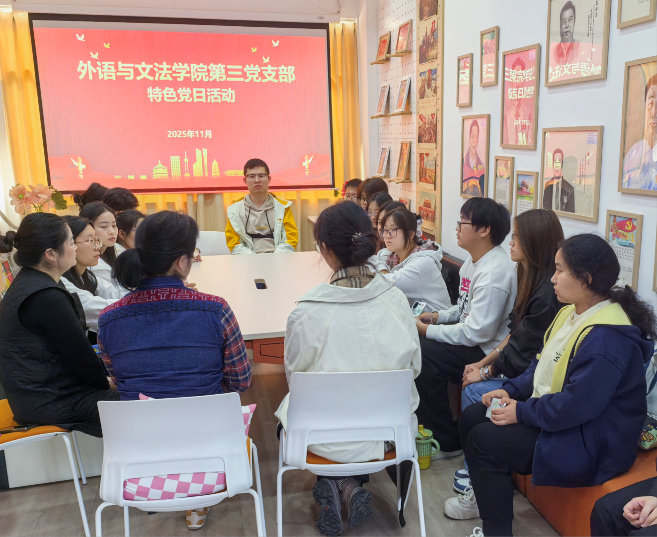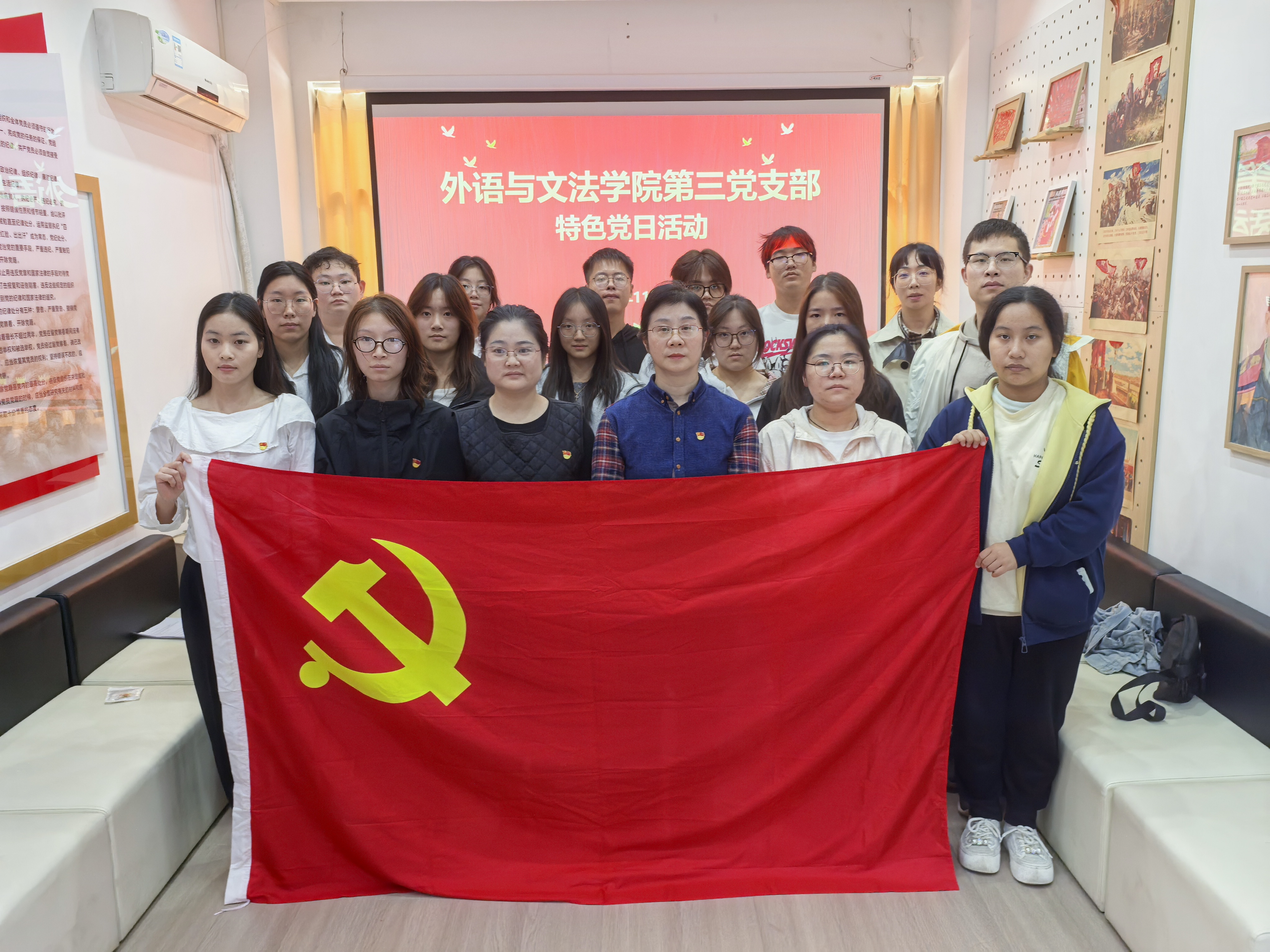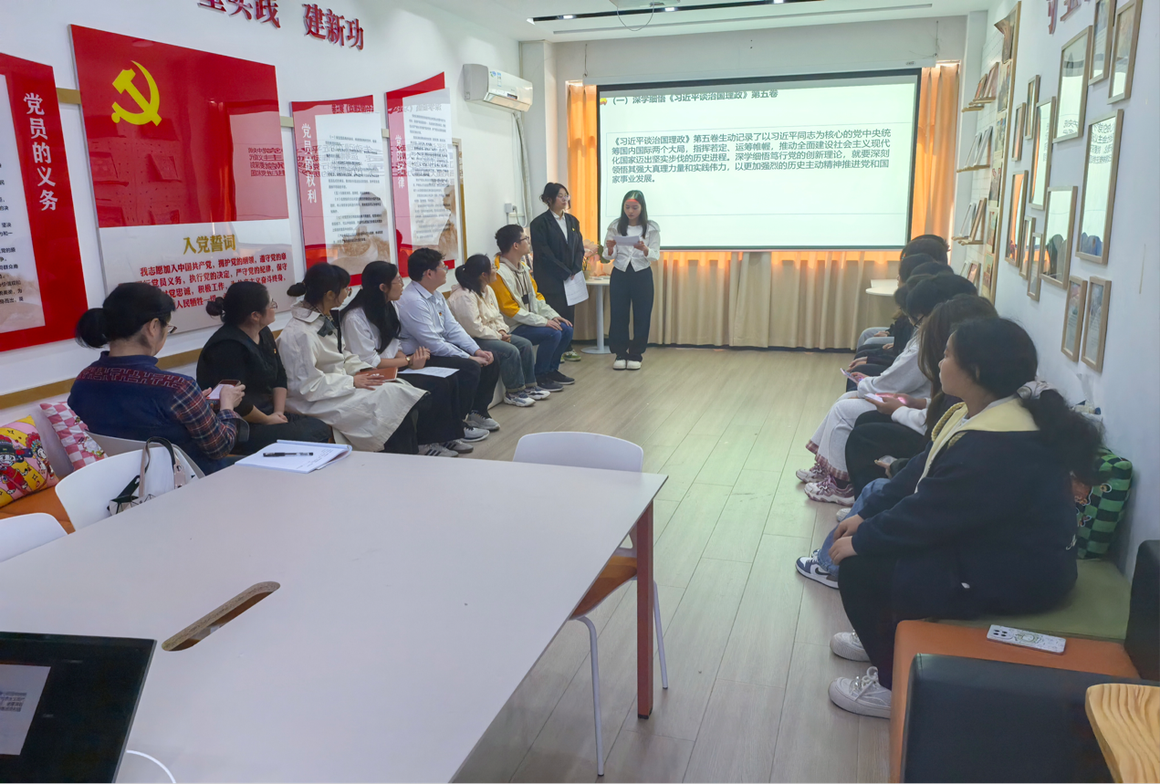 为引导青年党员坚定听党话、跟党走的政治自觉,在学思践悟中凝聚奋进力量,争做新时代有为青年。外语与文法学院第三党支部在3403党员活动中心组织开展了“赓续红色血脉,激扬青春担当”特色党日活动。 (一)活动主题 赓续红色血脉,激扬青春担当 (二)参与人员 组织员张蕾,外语文法学院党总支副书记郭咪咪,第三支部支部书记尹珊,第三支部党员代表,25级学生代表。 (三)活动纪实 为引导青年党员坚定理想信念、传承红色基因、勇担时代使命,2025年11月5日,外语与文法学院第三党支部在3403党员活动中心组织开展特色党日活动。组织员张蕾、党支部副书记郭咪咪、支部书记尹珊出席,支部党员代表及2025级新生代表参加。 活动在庄严的国歌声中拉开帷幕,学生党员谢雨晗带领全体党员重温入党誓词,铿锵有力的誓词增强了组织凝聚力,激发了敢于担当、砥砺奋进的精神力量,推动了党员将誓言内化于心、外化于行。 全体人员集体观看理论宣讲视频《峡江上的传承》,“语”路同行理论宣讲团党员及入党积极分子,在实践中感悟革命先辈奋斗历程与共产党人精神血脉。通过社区宣讲、群众帮扶等志愿行动,追寻宜昌三峡红色足迹,将理论学习与服务人民结合,让“志愿红”与“党建红”“传承红”同频共振,以实干诠释信仰传承。 ![]() 学生党员李庆芳领学习近平《治国理政》相关篇章,她结合外语与文法专业特点,深入解读新时代治国理政的核心理念,倡导将理论学习融入专业实践,号召青年党员积极参与各类文体活动和社会实践,发挥先锋模范作用,展现新时代青年的昂扬风貌。 ![]() 在“学习三大精神”专题环节,学生党员孟宇娇、杨瑞、杨依雪分别围绕大别山精神、抗洪精神、抗疫精神进行领学分享。她们以青年视角讲述英雄故事,用“青言青语”阐释精神实质,将伟大精神与现实生活紧密结合,引发在场师生强烈共鸣,进一步激发了青年党员的责任担当。 ![]() ![]() ![]() 活动设置新老生座谈环节,聚焦新生入学初期面临的思想困惑、学业压力与生活适应等问题。新生代表敞开心扉、坦诚交流,老党员结合自身成长经历耐心答疑、倾囊相授,现场气氛热烈而温馨。交流不仅解决了实际问题,更传递了组织的关怀与温暖,坚定了新生的理想信念。 ![]() 组织员张蕾作总结讲话。她充分肯定本次活动形式多样、内容扎实、富有温度,称赞学生党员领学“有深度、有温度”,对老党员用心帮扶新生表示赞赏。她勉励新生要勇于尝试、不惧失败,积极融入大学生活,享受成长过程,在党组织的培养和引领下,努力成长为有理想、敢担当、能吃苦、肯奋斗的新时代青年。 ![]() 1. 强化思想引领,筑牢信仰之基。通过红色教育与理论学习,党员们接受了一次深刻的思想洗礼,进一步坚定了理想信念,增强了历史自觉和使命意识。 2. 增强组织凝聚力,搭建成长平台。新老生面对面交流,既传承了经验,也拉近了距离,有效增强了支部的向心力与归属感,营造了团结奋进的组织氛围。 3. 激发青春担当,凝聚奋进力量。新生代表纷纷表示,将以此次活动为起点,传承红色基因,勇担时代重任,在未来的学习与实践中砥砺成长,让青春在党旗下熠熠生辉。 外语与文法学院第三党支部将持续深化党建品牌建设,创新活动形式,拓展育人路径,以红色精神滋养青年心灵,以组织力量引领青春航向,让信仰之光照亮每一位青年党员的前行之路。 (五)支部介绍 外语与文法学院党总支第三党支部由教师党员和英语、商务英语两个专业学生党员组成,共有 8 名正式党员,12 名预备党员。党支部以标准化党支部建设为基点,坚持“党建示范创建党建质量提升”的工作主线,将基层党建工作与中心工作深度融合,依托英语专业特色,积极创建“思政进课堂”“双语微党课”“珍珠宝贝”“英语角”“红旗颂”理论宣讲团、“语”路同行志愿服务队、“清廉颂”朗诵队等品牌活动。 部分优秀党员代表如下: 尹珊:荣获学院“优秀共产党员”“青年岗位能手”“就业工作先进个人”“优秀班主任”等荣誉称号,获学院辅导员职业技能大赛二等奖。 杨依雪:获评学院“三好学生”“优秀青年志愿者”“优秀学生干部”“优秀学工助理”“优秀共青团干”“暑期社会实践先进个人”等荣誉称号,荣获学院丙等奖学金。 李庆芳:获评学院“优秀学生干部”“三好学生”“优秀共青团干”校级“优秀共青团员”“优秀学工助理”等荣誉称号,曾获学院国家励志奖学金、乙等奖学金、丙等奖学金。 孟宇娇:获评学院“三好学生标兵”“三好学生”“优秀学生干部”“暑期社会实践先进个人”“十佳青年志愿者”“优秀共青团员”“励志先锋”“优秀学工助理”等荣誉称号,曾获学院乙等奖学金、丙等奖学金、国家励志奖学金。