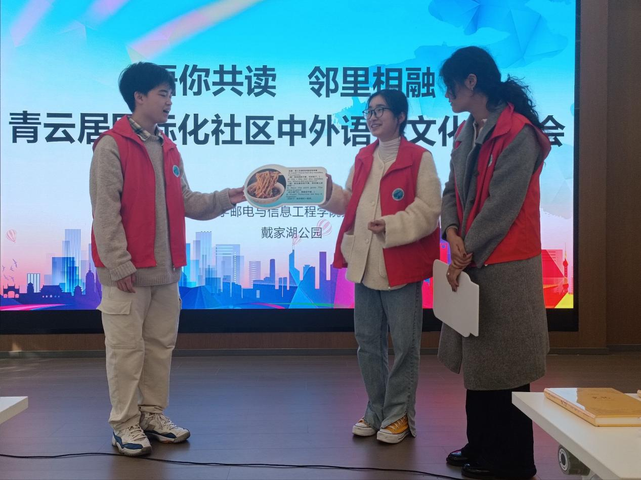 活动现场,周烈傲、何梦婷、王迪三位志愿者结合外语专业优势,带来生动的情景对话分享。三人通过模拟日常交流、社区服务等生活场景,以自然的互动、清晰的表达展现语言应用技巧,为社区居民搭建起高效沟通的实践参考模式。居民们听得专注,学得投入,纷纷表示收获颇丰,将把所学运用到日常交流中,现场氛围轻松活跃、暖意融融。