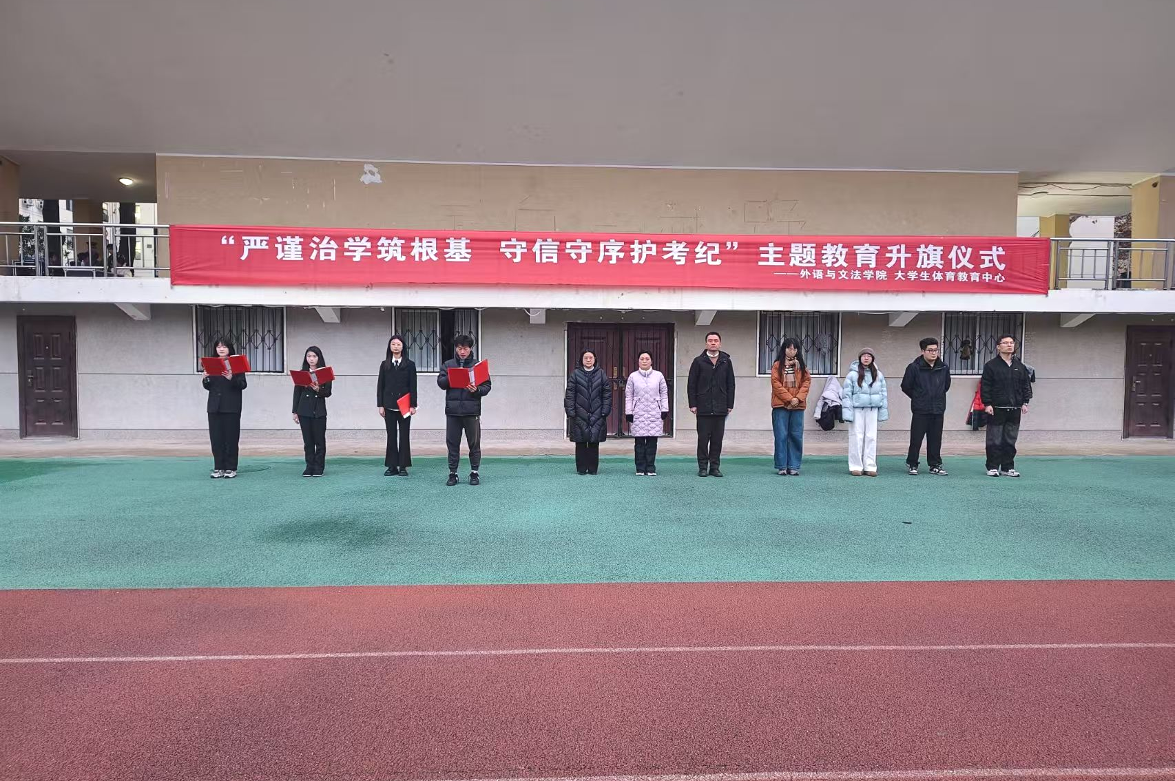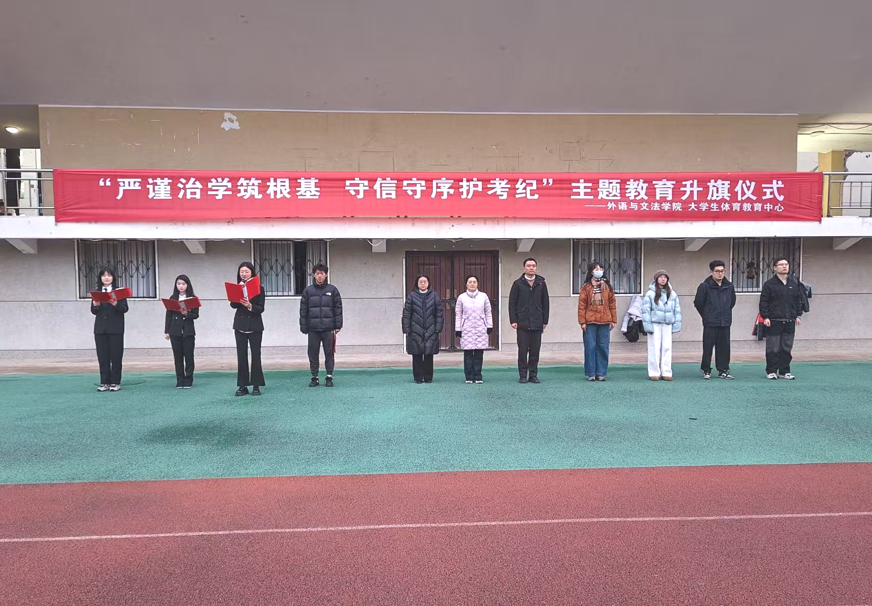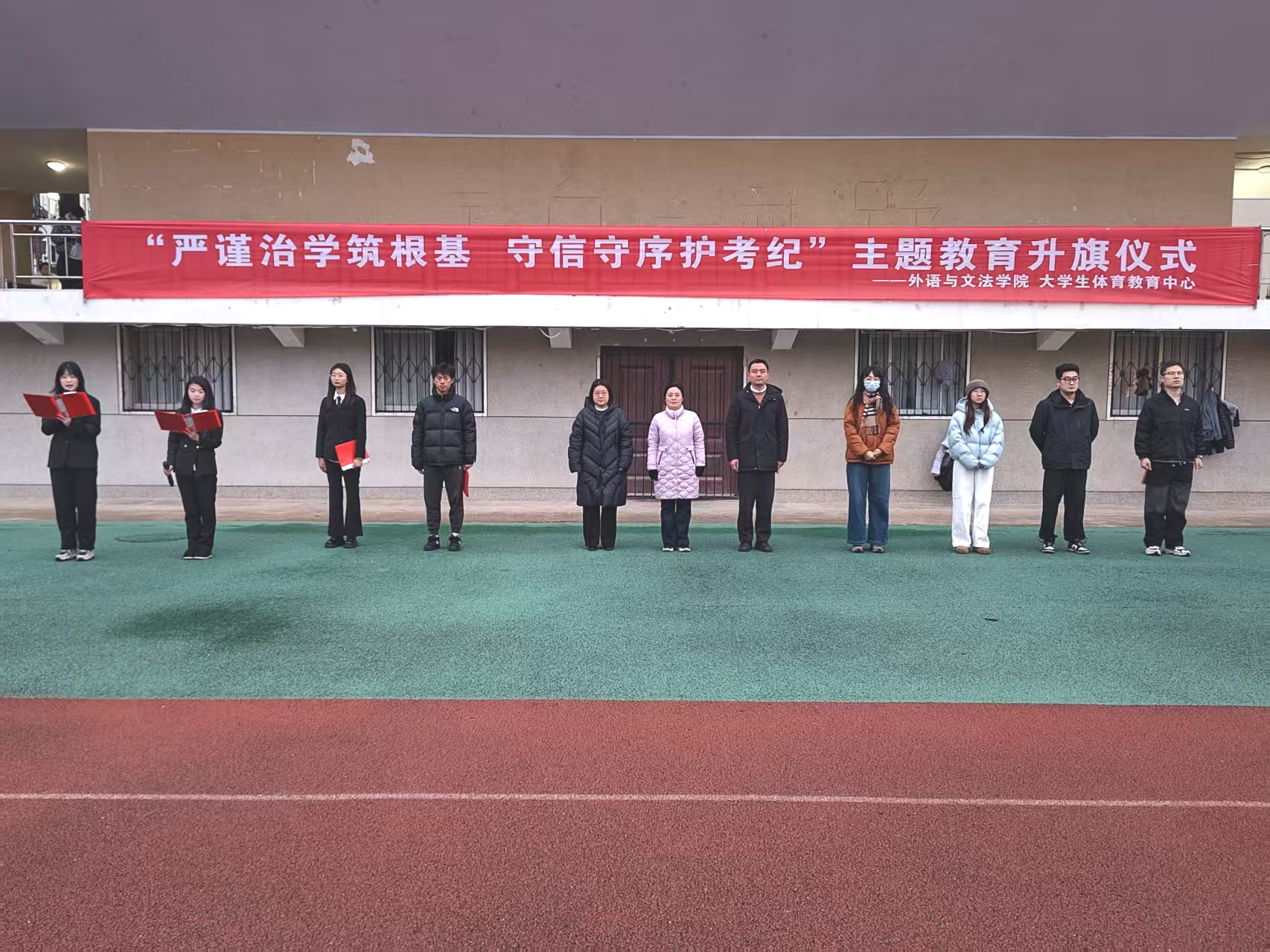 为深化学院学风建设,厚植学子严谨治学底色,筑牢诚信应考准则,引导全体同学以端正学风笃行求学初心,12月22日7:00,外语与文法学院与大学生体育教育中心在武昌校区操场联合举行“严谨治学筑根基,守信守序护考纪”主题教育升旗仪式。外语与文法学院班子成员、全体辅导员及在校学生共同参与此次活动。