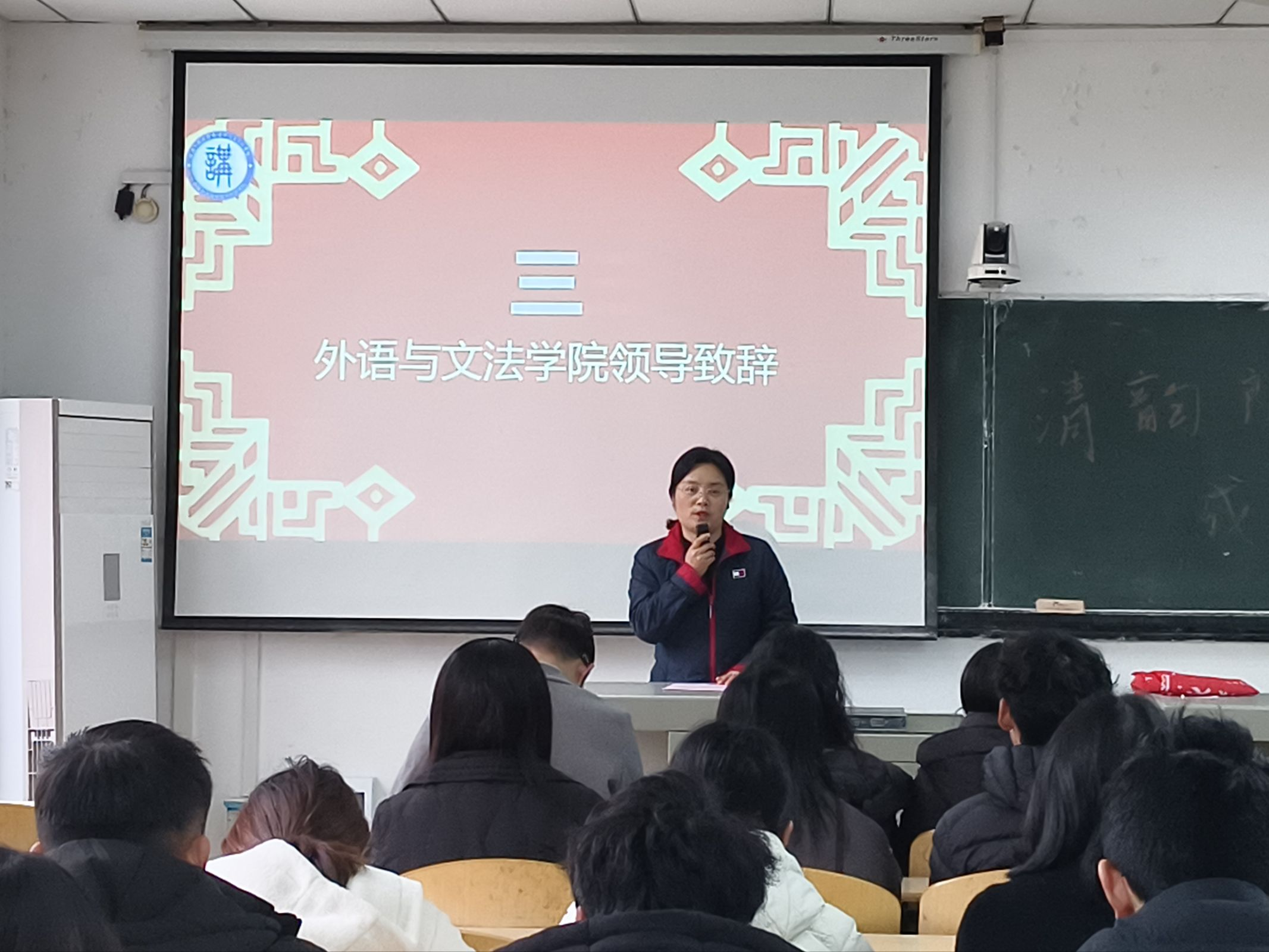 外语与文法学院党总支书记、院长李春英致辞。她向朗诵队的正式成立表示祝贺,并指出,朗诵队的成立兼具党建文化建设与学生素养提升意义,她要求队员不断夯实普通话及发音基础,鼓励朗诵队发挥专业融合优势,为学院高质量发展赋能。