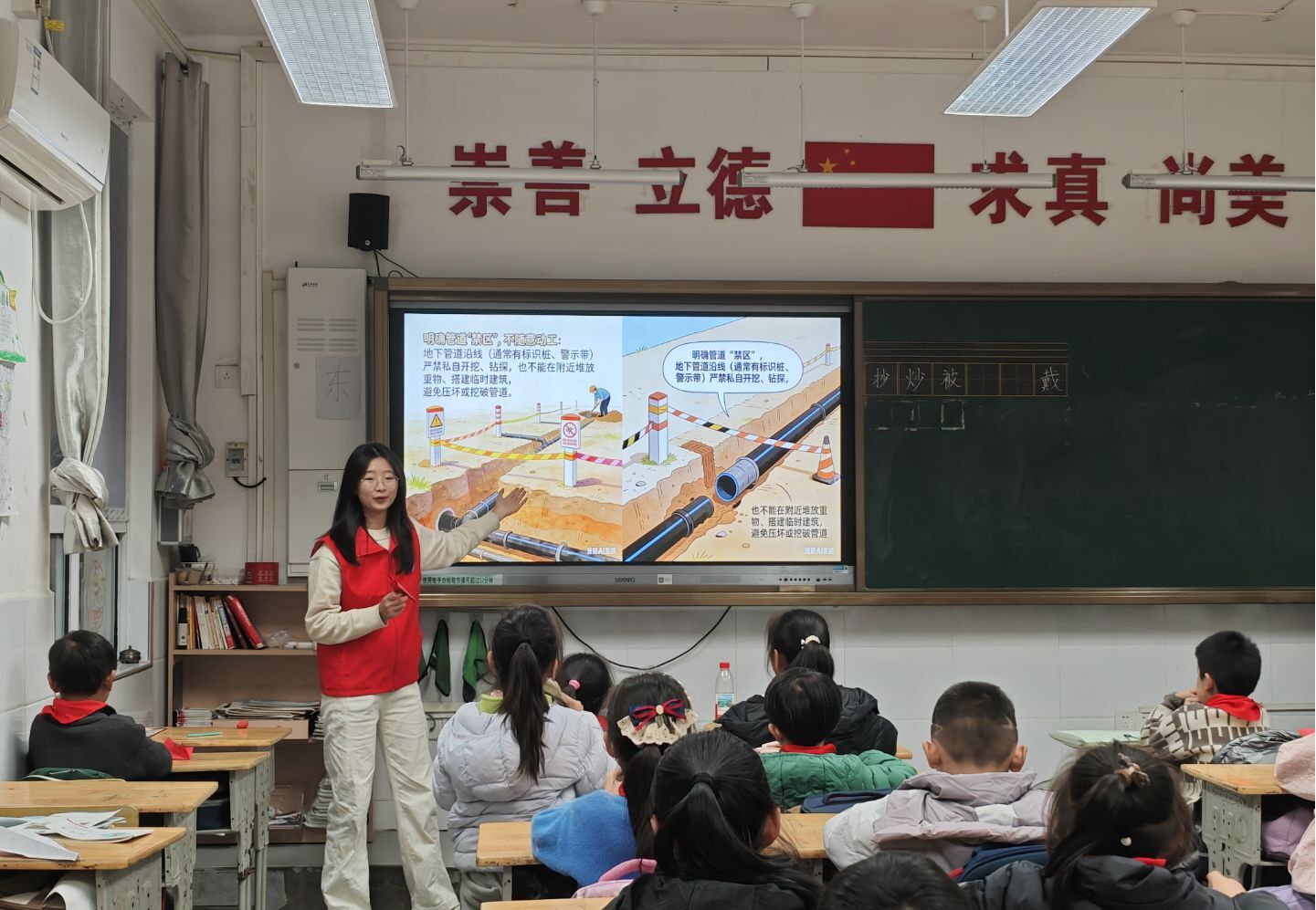 课堂上,志愿者采用图文并茂的讲解形式,既清晰界定了管道保护“禁区”的行为准则,指导孩子们辨识各类管道警示标识,又细致传授了管道泄漏、违规施工等突发情况的正确处置方法,同时叮嘱大家切勿在管道周边乱植深根植物、向排水口倾倒油污,引导孩子们从日常点滴做起,筑牢管道安全守护防线。 ![]()