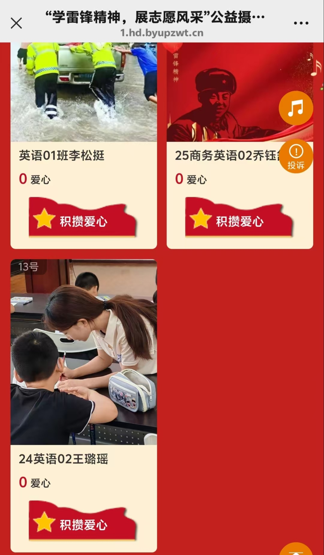 3月16日,学院举办“学雷锋精神·展志愿风采”公益摄影活动,面向全院学生征集以“照片+寄语”为形式的优秀作品。活动聚焦身边好人好事、暖心爱心瞬间与志愿服务场景,引导广大学生用镜头定格美好、以影像记录雷锋精神的生动实践,切实将思政教育、公益实践与美育熏陶深度融合,让新时代雷锋精神在校园中落地生根、熠熠生辉。