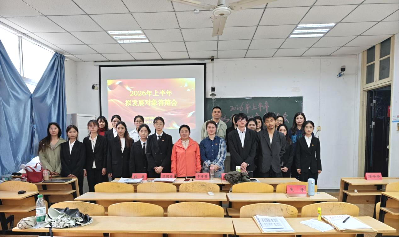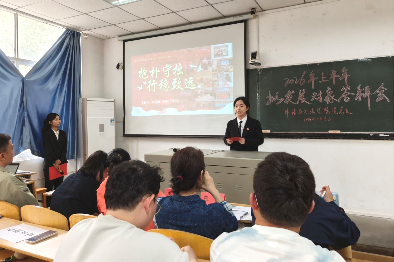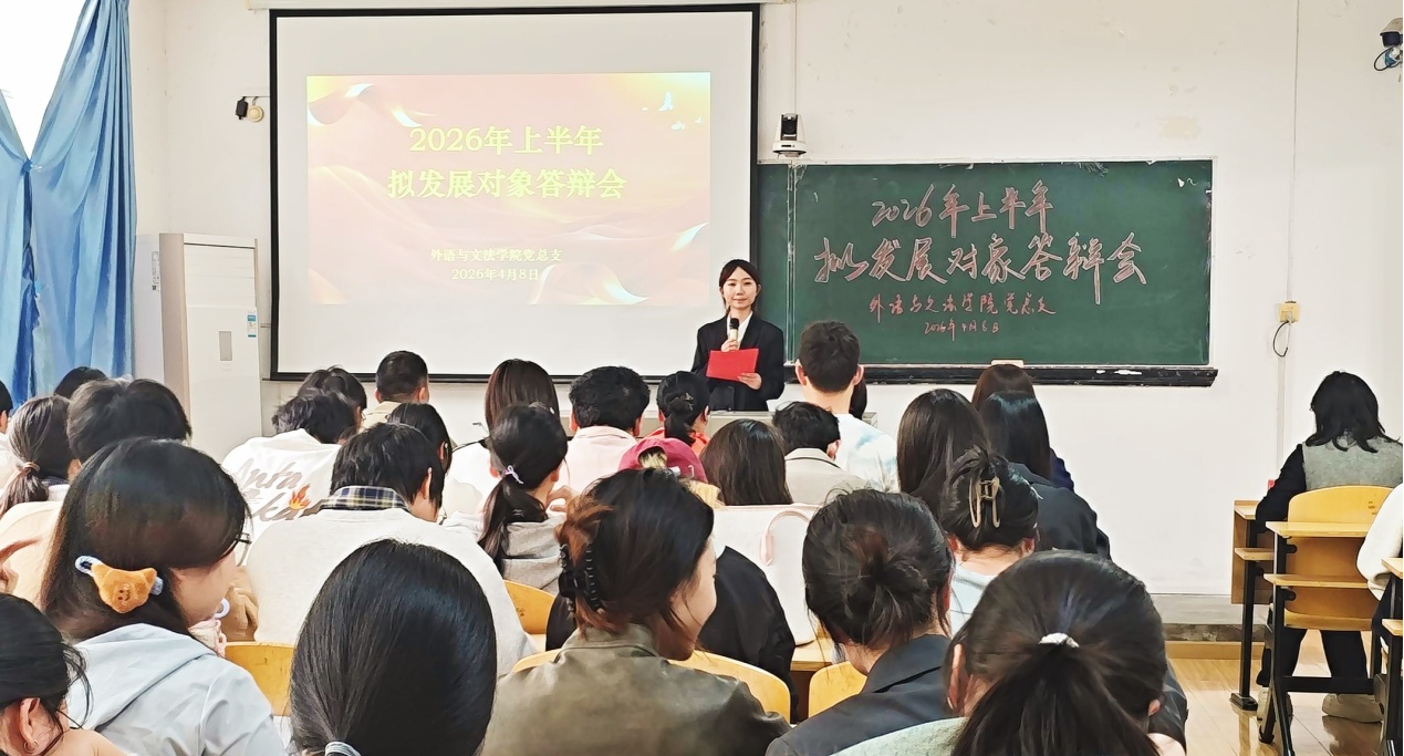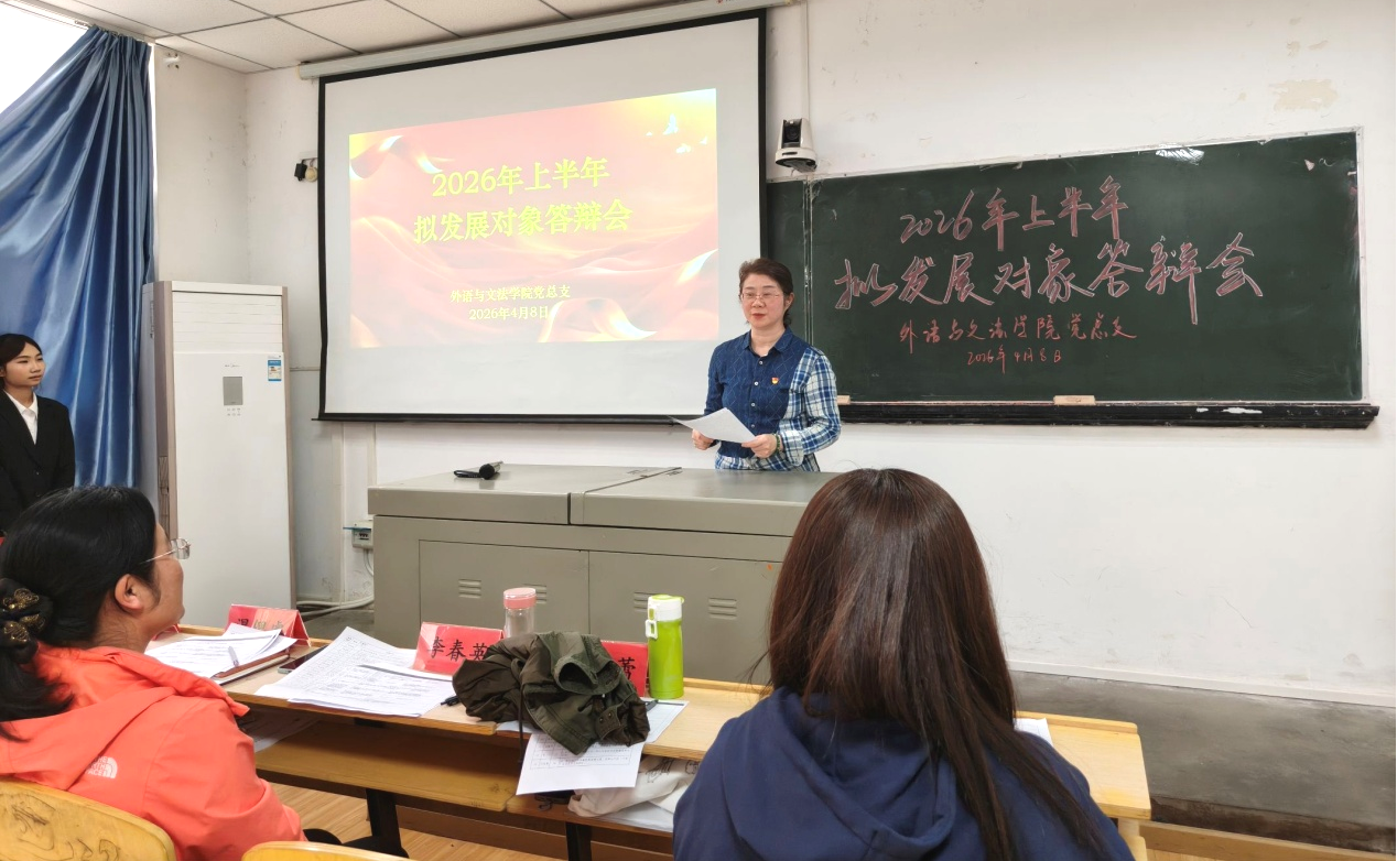 为严格落实党员发展工作各项要求,切实提升党员党性修养与综合素质,不断提升党员发展质量,4月8日下午,外语与文法学院党总支在1308教室召开2026年上半年拟发展对象答辩展示会。学院党委组织部组织员张蕾莅临现场指导,外语与文法学院党总支书记、院长李春英,副院长温偲睿,党总支副书记熊巍,第一党支部书记陈平香、第二党支部书记吴丹、第三党支部书记涂晟楠、第五党支部书记徐特共同担任答辩评委,学院全体学生党员及入党积极分子参会。本次会议由24级英语02班王璐瑶同学主持。