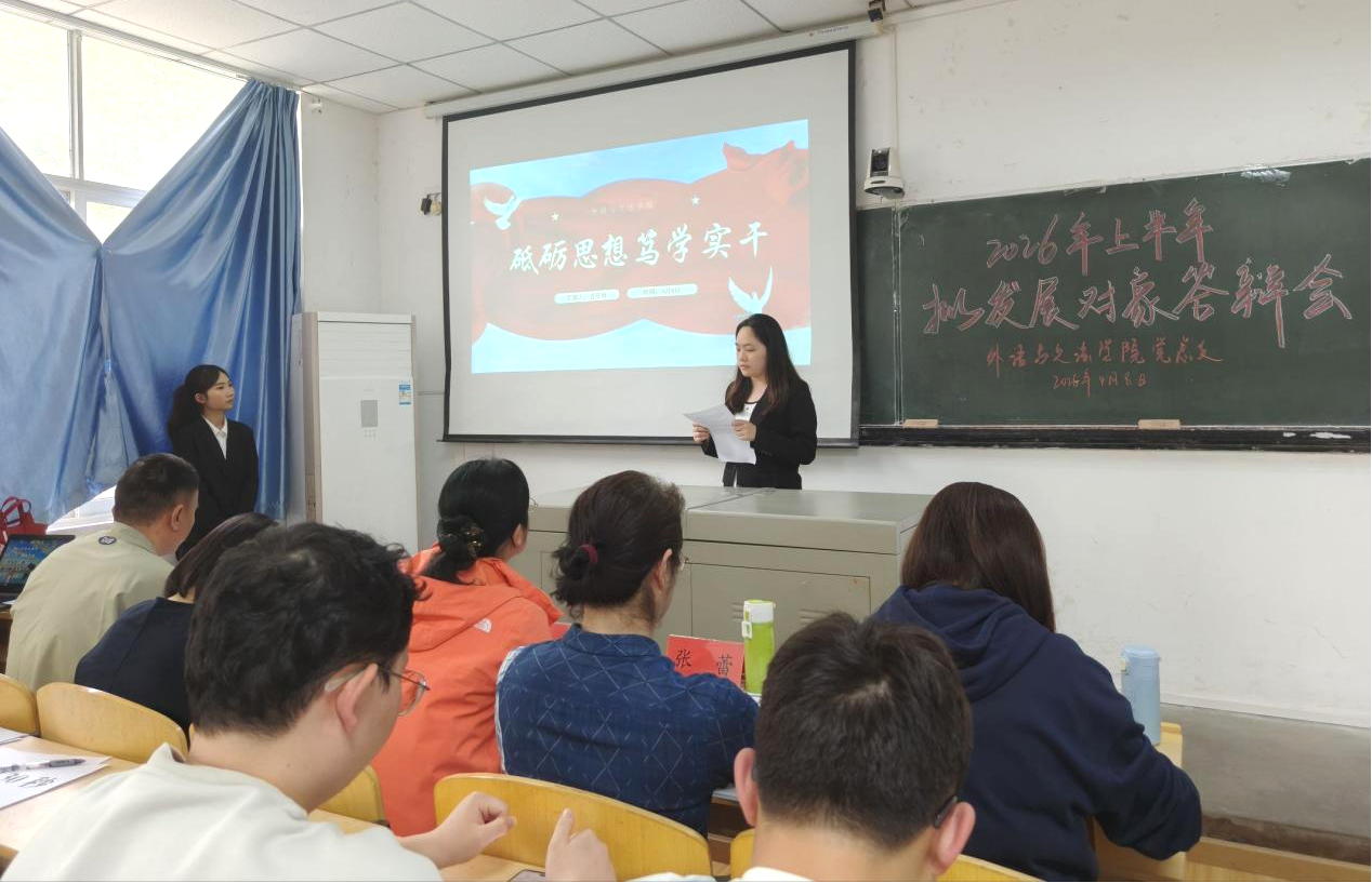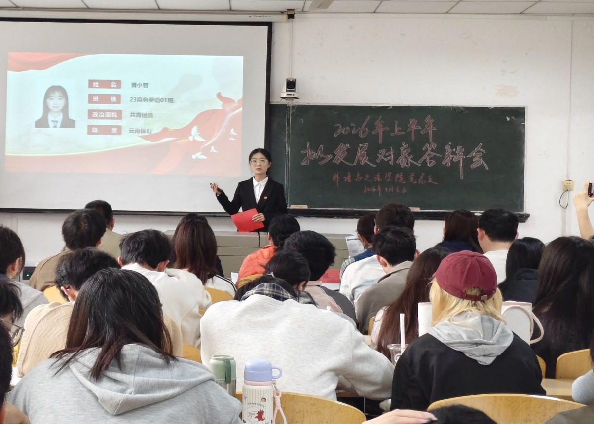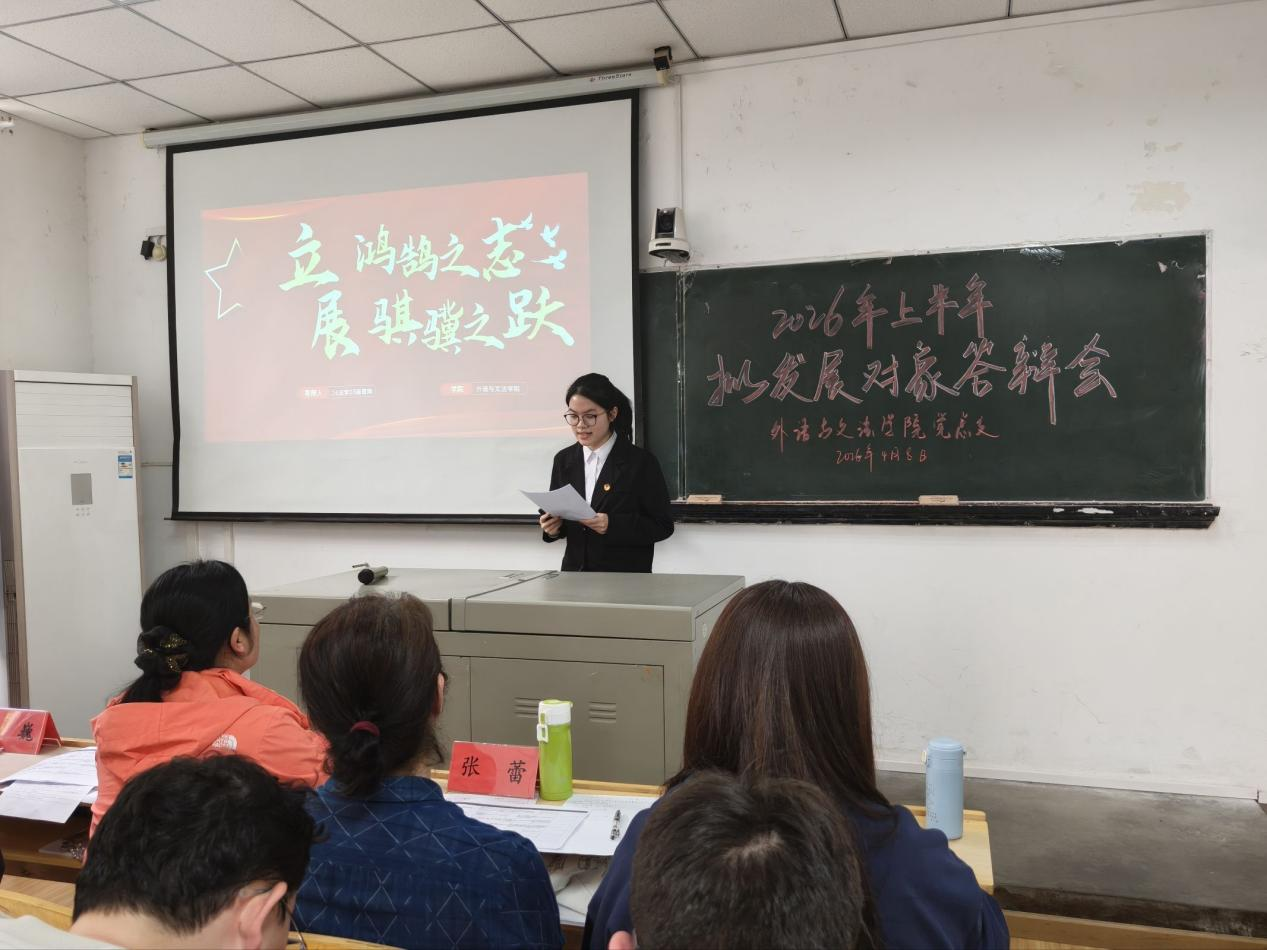 为严格落实党员发展工作各项要求,切实提升党员党性修养与综合素质,不断提升党员发展质量,4月8日下午,外语与文法学院党总支在1308教室召开2026年上半年拟发展对象答辩展示会。学院党委组织部组织员张蕾莅临现场指导,外语与文法学院党总支书记、院长李春英,副院长温偲睿,党总支副书记熊巍,第一党支部书记陈平香、第二党支部书记吴丹、第三党支部书记涂晟楠、第五党支部书记徐特共同担任答辩评委,学院全体学生党员及入党积极分子参会。本次会议由24级英语02班王璐瑶同学主持。